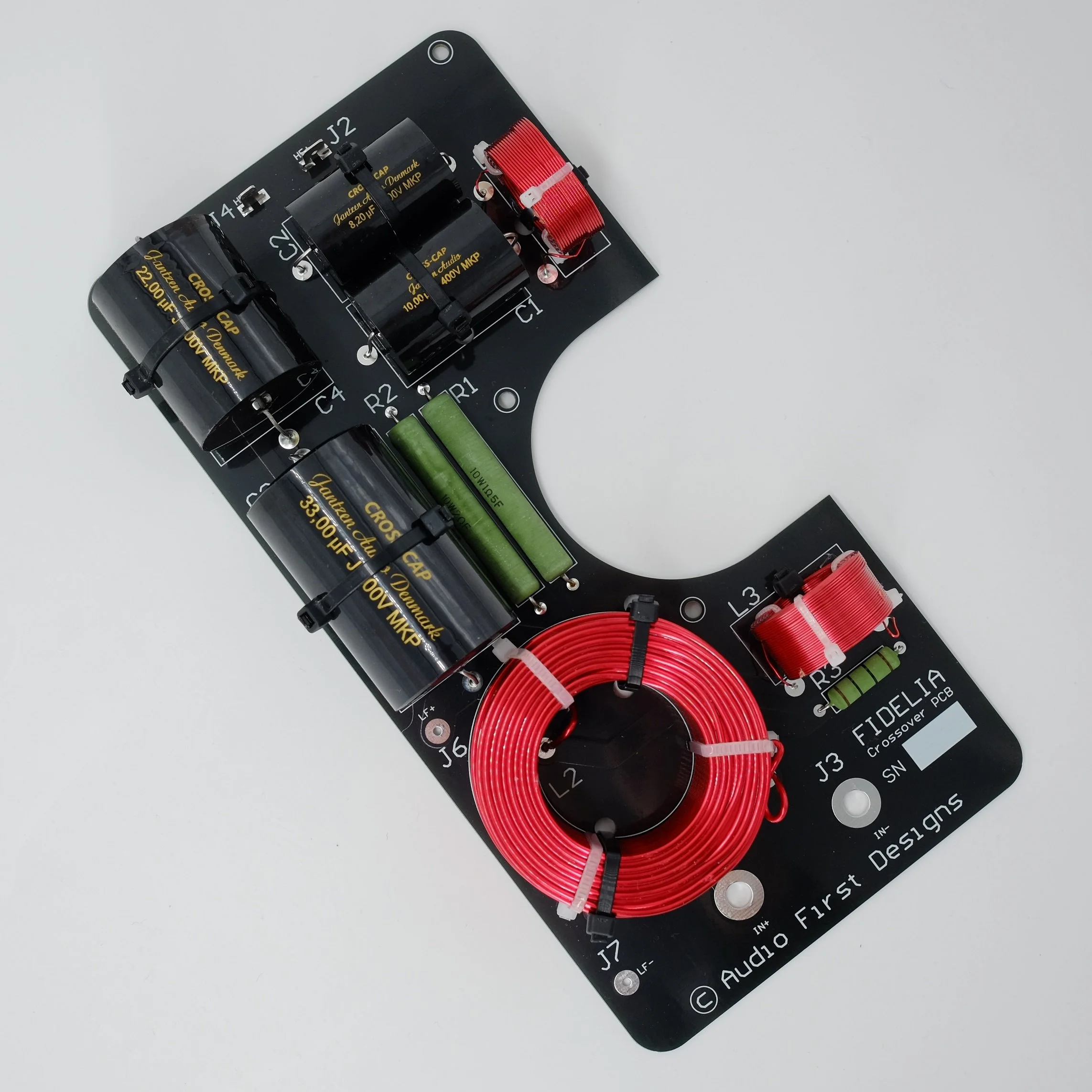 The crossover of Fidelia only consists of high-quality film capacitors (Jantzen Audio, Denmark), air-core inductors, and non-inductive wire wound resistors, to ensure the design has minimum component distortions to begin with. The crossovers are all assembled, checked, and matched. No soldering is required.