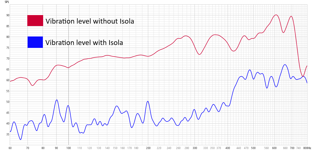The Isola was originally developed for some of the earliest Fidelia customers who needed to place their speakers on TV shelves, using 3 Isola units under each speaker helps eliminate unwanted vibrations and resonances in the shelf. Customers have consistently reported a noticeable improvement in clarity, particularly in the bass and lower midrange regions. Isola is also effective for other vibration-sensitive audio equipment, such as turntables. The figure below shows an example of accelerometer measurements in the horizontal direction taken on a TV shelf with and without the Isola.